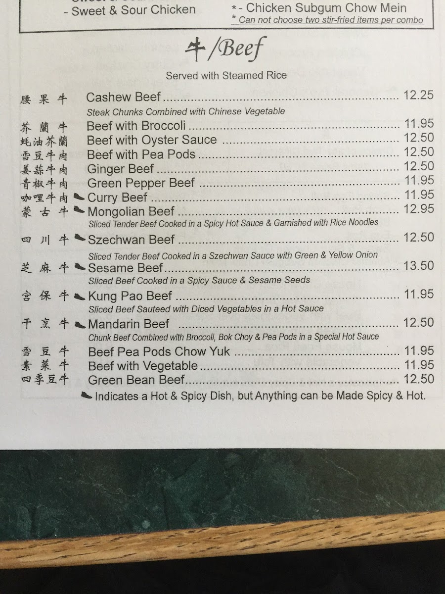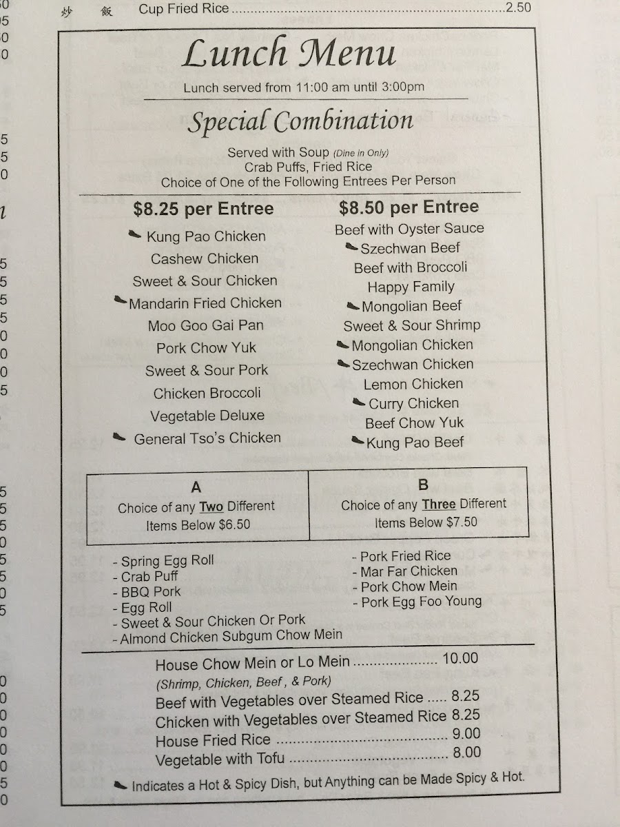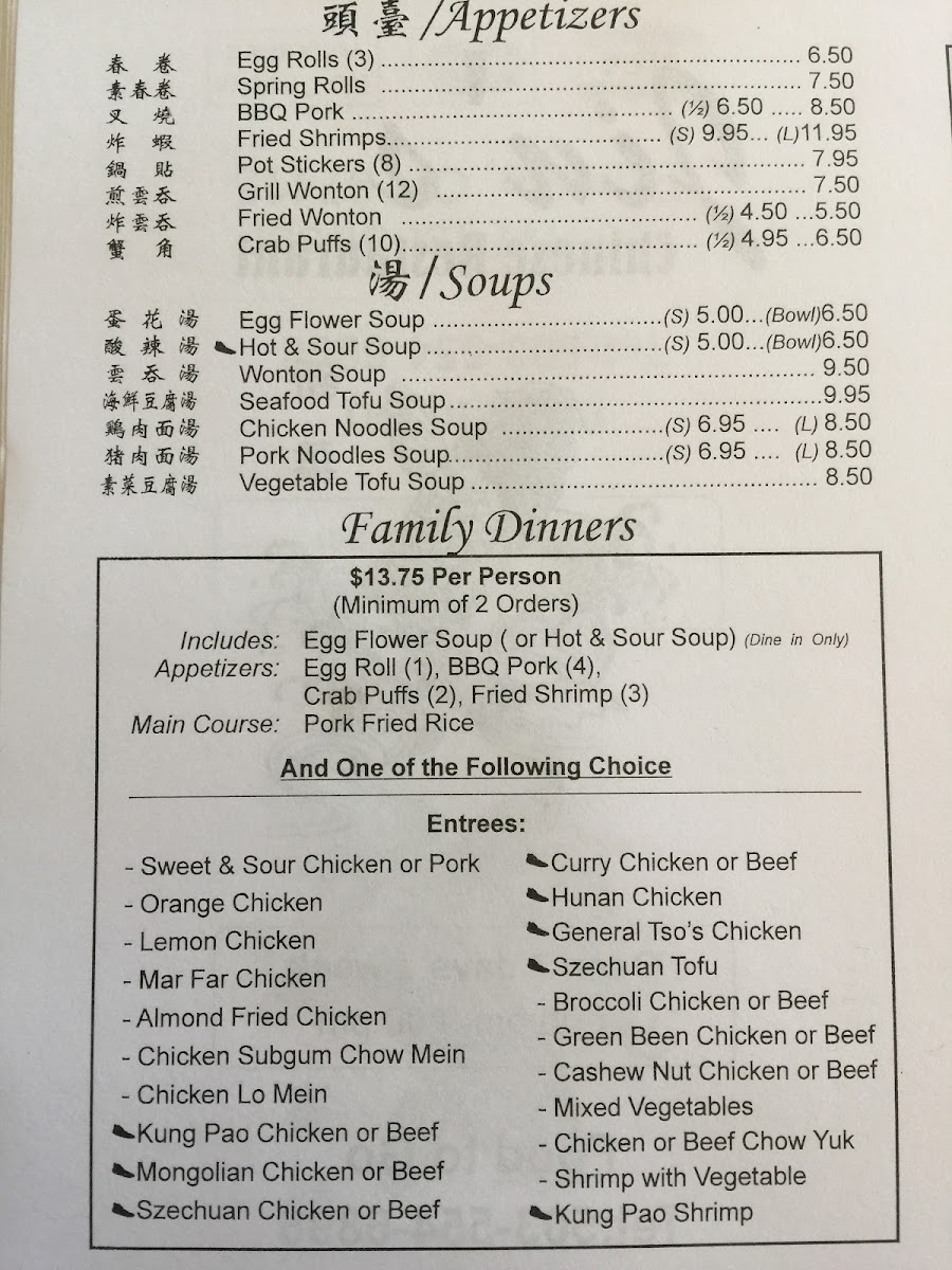 Includes: egg roll, pork fried rice. Sweet and sour chicken, crab puffs and one entree from the list below. Hot and spicy dishes are noted, but anything can be made hot and spicy - just ask!