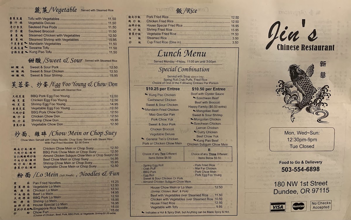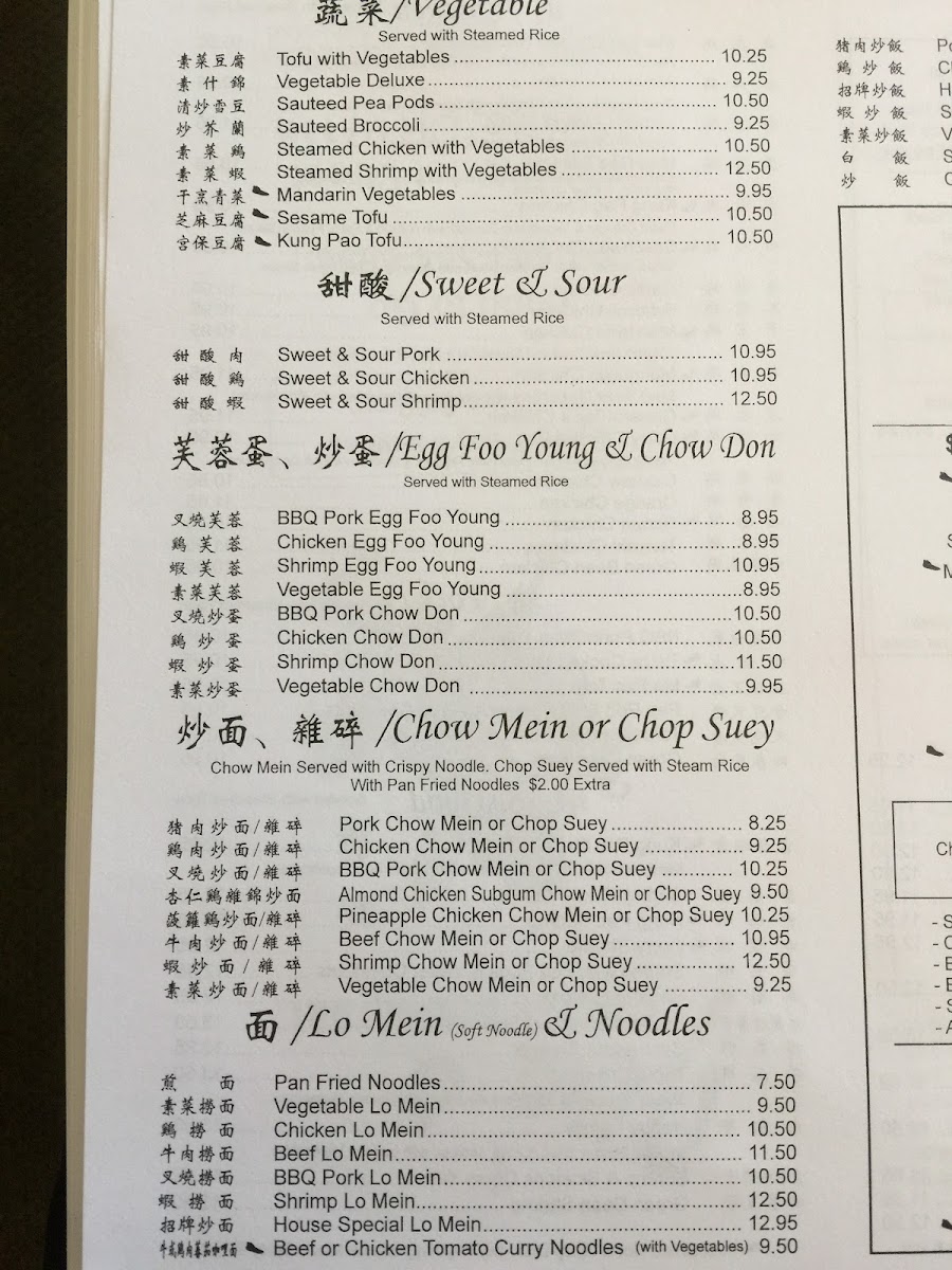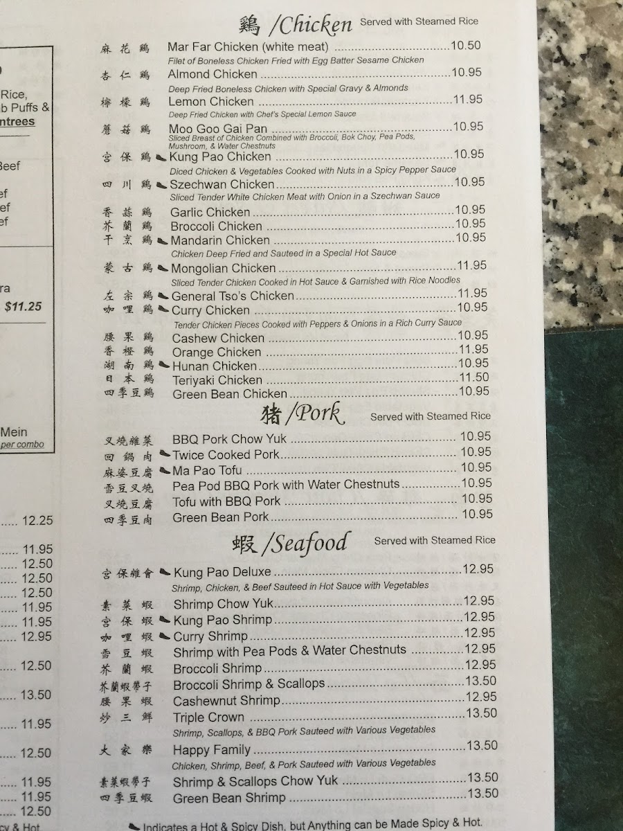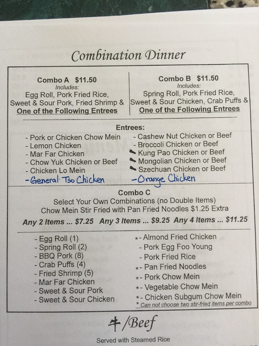 Includes: egg roll, pork fried rice. Sweet and sour chicken, crab puffs and one entree from the list below. Hot and spicy dishes are noted, but anything can be made hot and spicy - just ask!